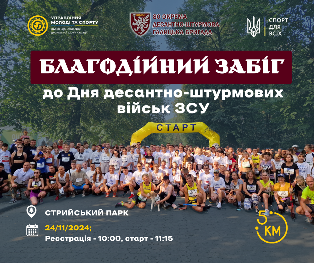 Організаторами благодійного пробігу є Управління молоді та спорту Львівської обласної військової адміністрації, Львівський обласний центр фізичного здоров’я населення “Спорт для всіх” та 80 окрема десантно-штурмова Галицька бригада.